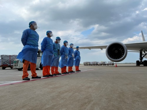 高溫下,上海浦東機(jī)場(chǎng)的機(jī)坪上,身穿“大白”“小藍(lán)”的東航裝卸員正在確認(rèn)信息,悶熱的防護(hù)服下,每一個(gè)作業(yè)動(dòng)作都是汗水。