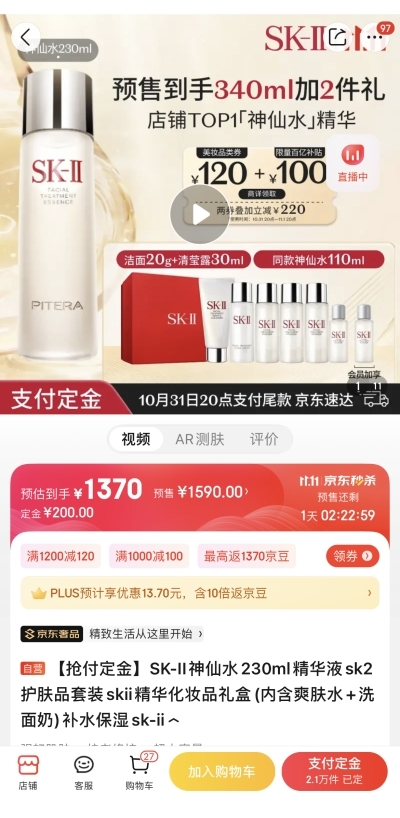 享譽全球的SK-II鎮(zhèn)店王牌神仙水,是每個精致女孩化妝臺上的必備好物。其蘊含超過90%的天然生物成分PITERA?,從根源強韌修護,顯著減少秋冬肌膚干燥泛紅,抑制老化因子,讓肌膚更加細膩緊致、晶瑩剔透。京東11.11期間,原價1590元的SK-II神仙水230ml裝到手價1370元,同時加贈神仙水110ml、潔面20g、清瑩露30ml,為消費者打造全流程的精致護膚體驗。