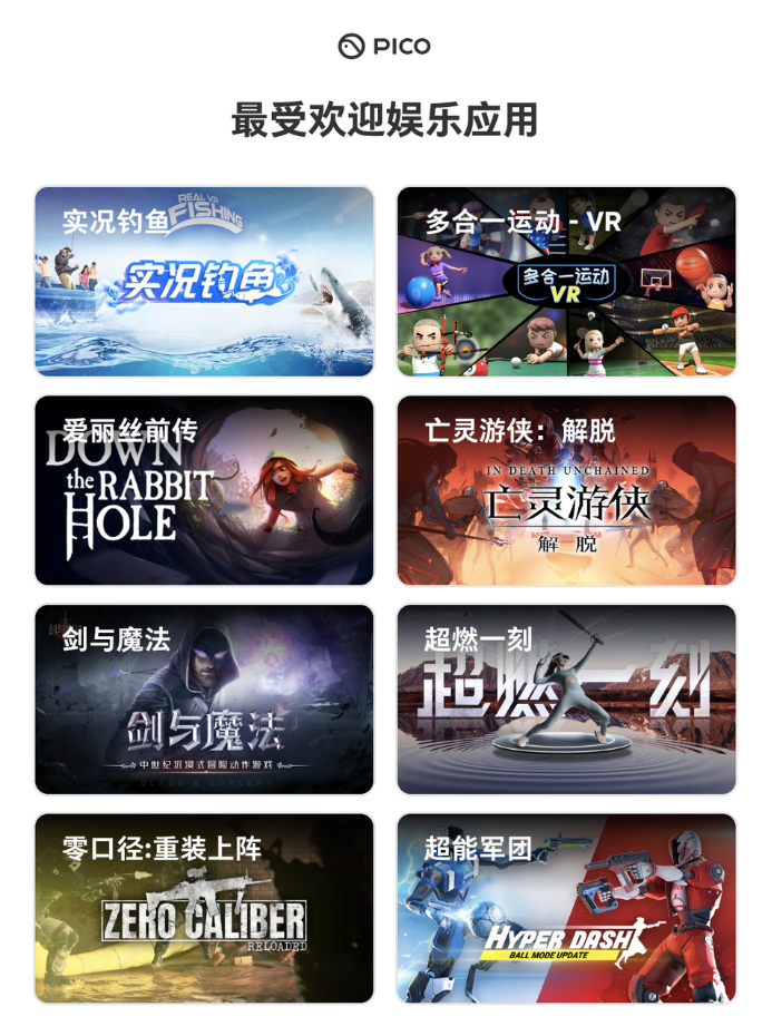 作為頭部XR品牌,PICO始終致力于幫助VR開啟大眾化之路,而豐富且優(yōu)質(zhì)的內(nèi)容和應(yīng)用生態(tài),是吸引大眾消費(fèi)者購買VR、使用VR的關(guān)鍵。近兩年全球VR技術(shù)日漸成熟,產(chǎn)品快速迭代,PICO作為國內(nèi)最完善的VR內(nèi)容平臺(tái),亦在持續(xù)完善內(nèi)容生態(tài),積極加速與第三方的合作腳步,并在自制內(nèi)容方面大力投入,致力打造國內(nèi)應(yīng)用最豐富、最優(yōu)質(zhì)的VR內(nèi)容平臺(tái)。迄今為止PICO應(yīng)用商店已擁有超過200款國內(nèi)外優(yōu)質(zhì)的VR應(yīng)用。