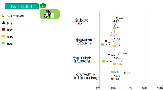 當(dāng)車輛怠速時(shí),發(fā)動(dòng)機(jī)的轉(zhuǎn)速僅600轉(zhuǎn),在省油的同時(shí),又進(jìn)一步降低了發(fā)動(dòng)機(jī)噪音,百公里油耗較同類機(jī)型油耗低5%以上。它的額定功率點(diǎn)燃油消耗率為215 g/(kW·h),在WTVC綜合油耗及等速油耗均優(yōu)于競(jìng)品。