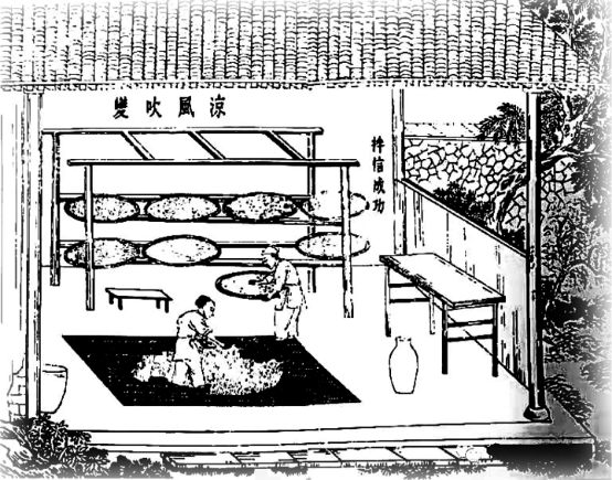 釀酒必須要用酒曲作為酒引子,沒有酒曲,即便有好米好黍也釀不出酒。為了釀出好的酒曲,宋應(yīng)星記錄道:“用楮葉包扎,懸風(fēng)處,或用稻秸罨黃,經(jīng)四十九日取用?!鼻摇吧S未足,視候不勤,盥拭不潔,則疵藥數(shù)丸動輒敗人石米。”意思是制曲之人需有耐心且細心,要時常查看酒曲的發(fā)酵情況,營造適宜酒曲發(fā)酵的環(huán)境。