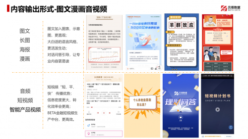 為此,貝塔數(shù)據(jù)團(tuán)隊(duì)搭建了“BETA內(nèi)容工廠”,并與內(nèi)外部合作伙伴合作,以確保金融機(jī)構(gòu)能夠獲得豐富的內(nèi)容資源。此外,他們還設(shè)計(jì)了12道工序進(jìn)行內(nèi)容清洗和分類,以確保內(nèi)容的合規(guī)性和質(zhì)量。數(shù)千個(gè)內(nèi)容標(biāo)簽和圖譜式的內(nèi)容管理可讓內(nèi)容互相關(guān)聯(lián),并基于算法+中臺(tái)的方法來(lái)提高內(nèi)容產(chǎn)出效率。最后,采用千人千面的方式進(jìn)行產(chǎn)出,以進(jìn)一步滿足投教的個(gè)性化需求。這些方法可以有效地保證金融機(jī)構(gòu)提供高質(zhì)量、大量的投教內(nèi)容。