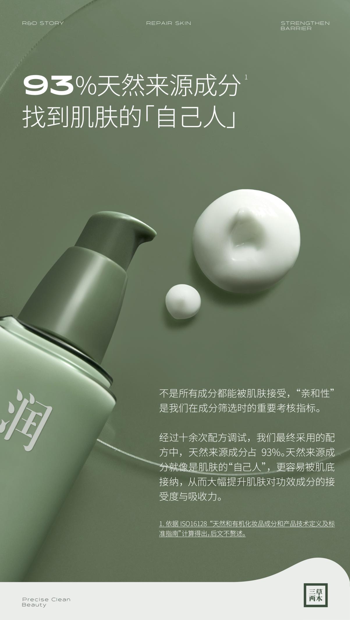 分膚定制專(zhuān)屬方案的搭建同樣離不開(kāi)活性成分的精準(zhǔn)篩選。為了幫助消費(fèi)者深度潤(rùn)澤肌膚,三草兩木選取崖壁上的潤(rùn)活精粹——鐵皮石斛提取物,用自然之力降噪保濕,令肌膚水潤(rùn)、嫩滑、透亮;4D透明質(zhì)酸鈉+PENTAVITIN?鎖水磁石的強(qiáng)力組合能夠有效鎖住游離水,幫助調(diào)控皮膚的含水量,進(jìn)一步滋潤(rùn)、光滑、細(xì)膩皮膚。更讓人驚喜的是,在三草兩木經(jīng)由十余次調(diào)試敲定的最終配方中,93%的成分都是天然來(lái)源,而且不添加任何對(duì)皮膚有風(fēng)險(xiǎn)的成分,敏感肌膚使用也完全沒(méi)有負(fù)擔(dān)。