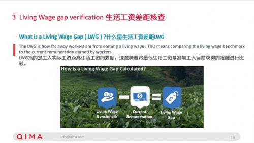 啟邁QIMA 專家同時提醒,企業(yè)還應(yīng)注意生活工資差距核查,即對最低生活工資基準與工人目前獲得的報酬進行比較。該驗證遵循IDH驗證指南,主要關(guān)注工資和福利,而不是標準的社會審核。審核方法包括工作情況面談、管理面談、文件審查和現(xiàn)場訪問,并特別注意數(shù)據(jù)準確性和工作類別。