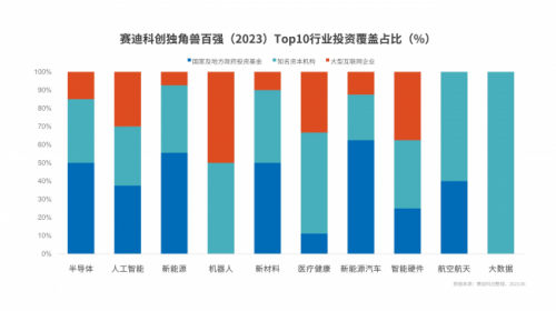 賽迪科創(chuàng)獨(dú)角獸百強(qiáng)(2023)中,獨(dú)角獸企業(yè)與國家及地方政府基金、知名資本機(jī)構(gòu)、大型互聯(lián)網(wǎng)企業(yè)投資關(guān)聯(lián)度達(dá)到93%,分別投資覆蓋(含重復(fù))了69家、65家、35家獨(dú)角獸百強(qiáng),初步形成“知名資本+大型互聯(lián)網(wǎng)企業(yè)+政府投資”三方格局。其中,新能源汽車、新能源、半導(dǎo)體和新材料行業(yè)政府基金投資覆蓋均超過50%,成為最受關(guān)注的賽道。