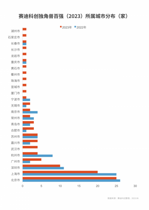 賽迪科創(chuàng)獨(dú)角獸百強(qiáng)(2023)中,北京、上海、深圳入榜獨(dú)角獸百強(qiáng)數(shù)量最多,分別為25家、20家和10家,在獨(dú)角獸企業(yè)發(fā)展質(zhì)量和數(shù)量方面位置穩(wěn)固。相比上一年,擁有2家及以上獨(dú)角獸百強(qiáng)城市數(shù)量進(jìn)一步增加,從10個(gè)增加至13個(gè),其中武漢凈增4家成為獨(dú)角獸百強(qiáng)增量第一城,合肥緊隨其后成功邁入獨(dú)角獸百強(qiáng)前十城市;而上海、杭州排名降幅榜前兩位,分別減少5家和4家。此外,天津、成都、東莞、威海、鎮(zhèn)江等7個(gè)城市上榜企業(yè)數(shù)量歸零。